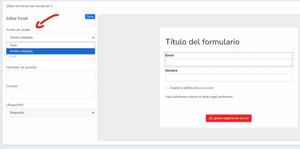 Por defecto estará en «ancho completo» haciendo que el campo utilice todo el ancho disponible del formulario.