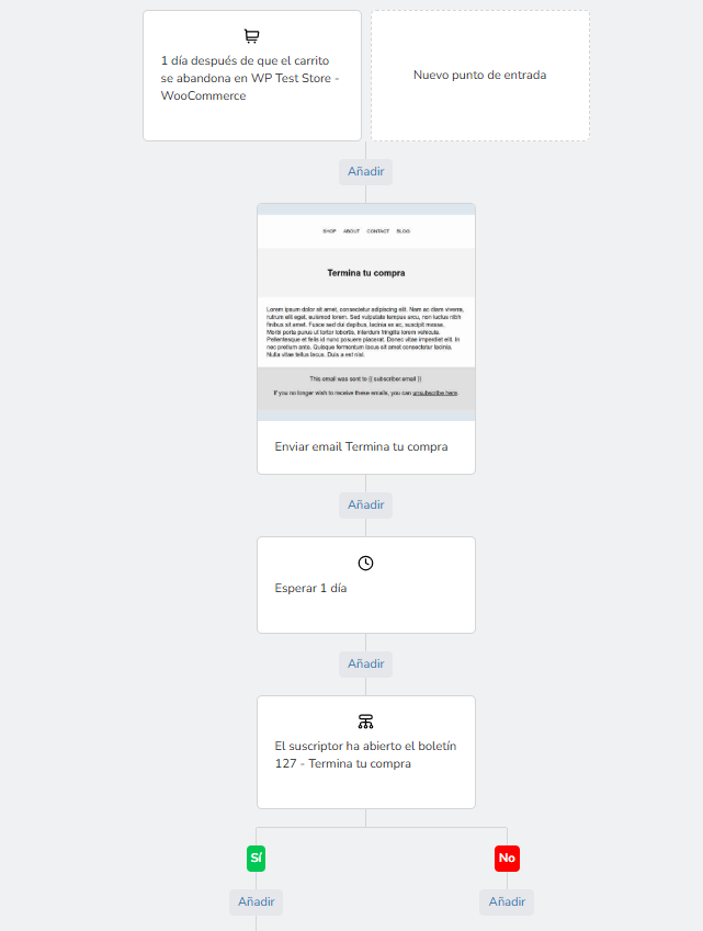 Y debajo tendrías un recorrido de recuperación de carrito, o carrito abandonado, con condicional final para comprobar si el email de recuperación ha sido abierto o no. Lo que permitiría continuar con un flujo de emails: